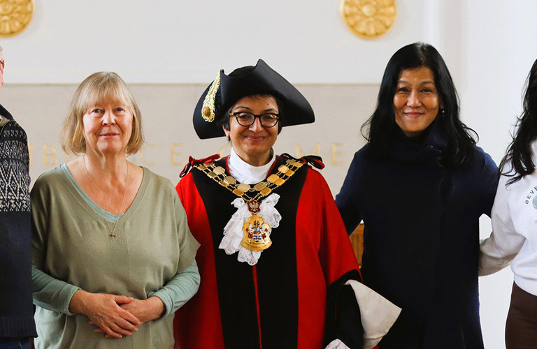 Left to Right - Our volunteers, Mike Joseph, Betty Sartorius, Phaik Connor and Anastasia Pascal with the Mayor of Islington, Councillor Anjna Khurana at our 21st November 2024 Community Voices - Lived Experience Peer Event.
